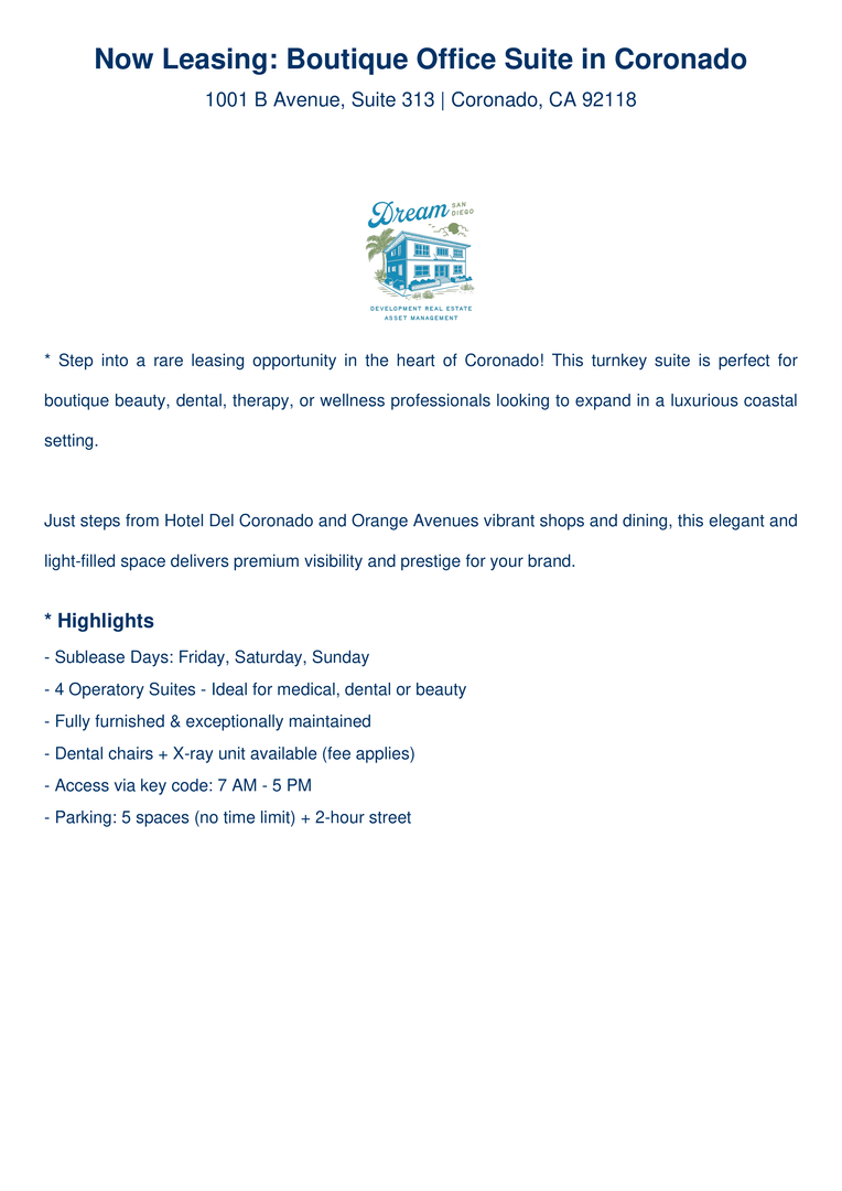 Boutique commercial suite in Coronado – ideal for beauty, dental, or wellness pros! 4 furnished rooms available for sublease (Fri–Sun). Steps from Hotel Del + Orange Ave, this light-filled suite features dental chairs & X-ray access (fee applies), keycode entry, ADA restroom, private waiting area & free garage parking. Perfect for IV therapy, lash techs, injectors, therapists & boutique offices. Walkable, accessible & ready for your brand.