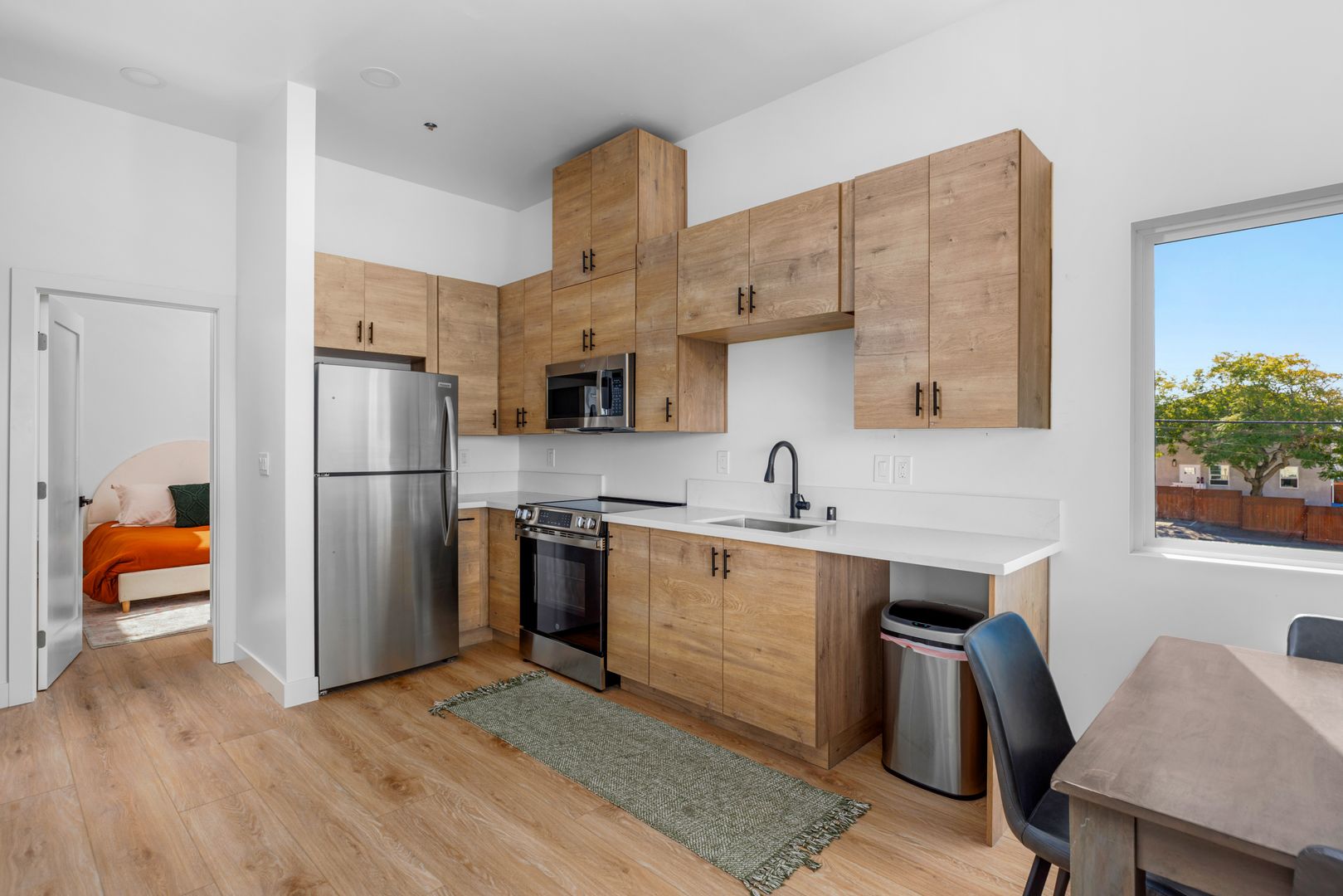 Brand-new modern kitchen with wood-style cabinetry